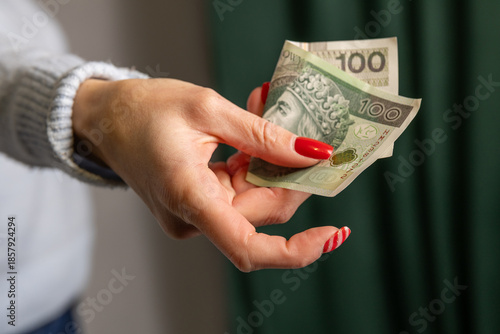 zgięty banknot 100 zł w dłoni kobiety