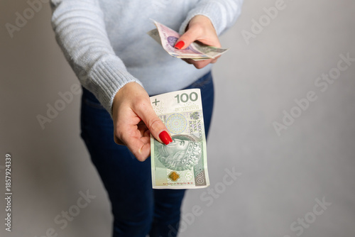 kobieta płaci gotówką. Banknot 100 zł w dłoni