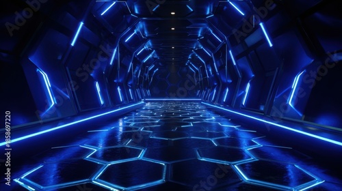 Futuristic corridor with neon blue lights and hexagonal pattern illustration