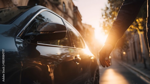 Close-up of a sleek black car door with a persons hand reaching for the handle in the sunlight.