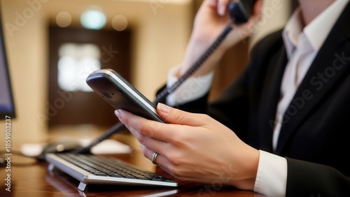 Busy hotel receptionist multitasking with smartphone and landline phone at front desk. Customer service professional managing reservations and calls in corporate office or hotel lobby workplace.