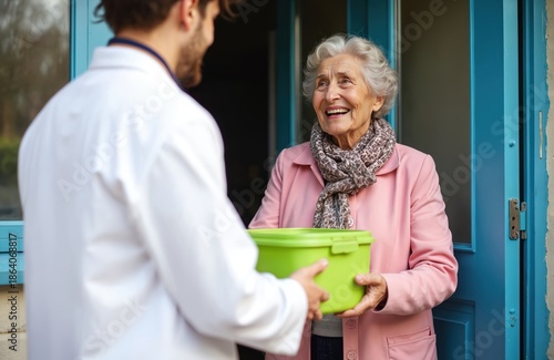 Man in white coat gives green food container to happy senior woman at her front door. Helper brings meal assistance for elderly person at home. Caring service for aged.