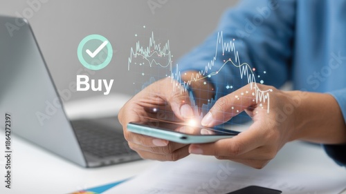 Investor using smartphone with cryptocurrency trends, buy sell trading signals, digital investment, and fintech technology for global financial growth.