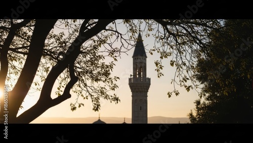 Golden hour illuminates the intricate silhouette of an ancient minaret, framed by the gentle embrace of tree branches, evoking a serene and timeless architectural beauty