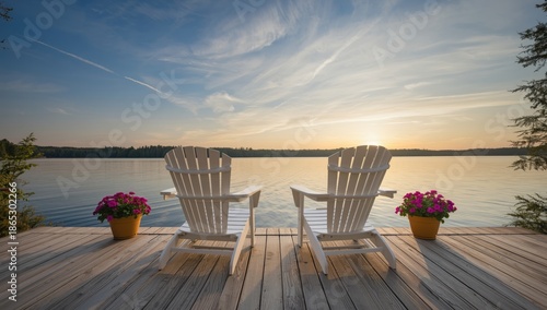 Wooden deck with white Adirondack chairs facing a lake, designed for outdoor recreation and scenic views, World Environment Day