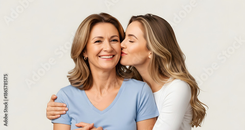 Beautiful adult daughter kissing happy senior mother on cheek isolated on light background