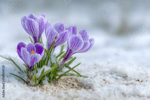 Fioletowe krokusy w śniegu, pierwsze oznaki wiosny i przebudzenie natury, delikatne kwiaty na zimowym tle.