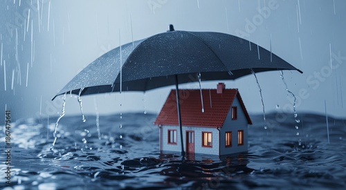 House protected by umbrella from rain and flood