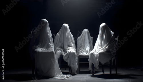 A frightening image captures seated, shrouded figures. The dark setting amplifies the fear and mystery, hinting at a supernatural encounter with a ghost.