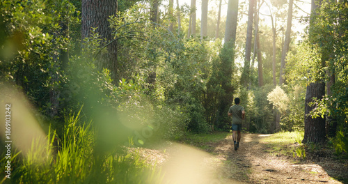 Fitness, back and man in forest with running, cardio and stamina training in sport challenge. Exercise, wellness and athlete in nature with jog, outdoor trail and endurance workout in Costa Rica.