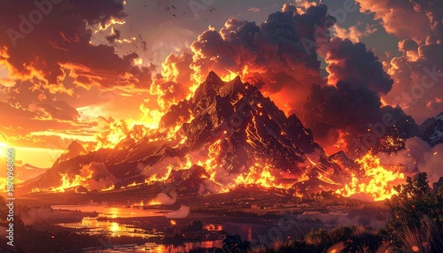 炎と雲に包まれた壮大なファンタジー山岳風景