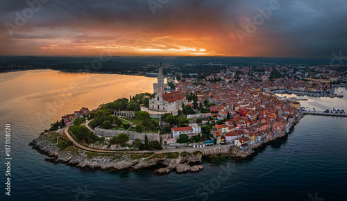 Rovinj, Croatia - Aerial panoramic view of the old town of Rovinj with Church of St. Euphemia and dramatic golden and blue sunrise on a summer morning in Istria, Croatia by the Adriatic sea