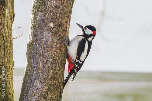 Dzięcioł duży (Dendrocopos major) siedzący na pniu drzewa w lesie, zbliżenie na detale kolorowego upierzenia ptaka w naturalnym środowisku.