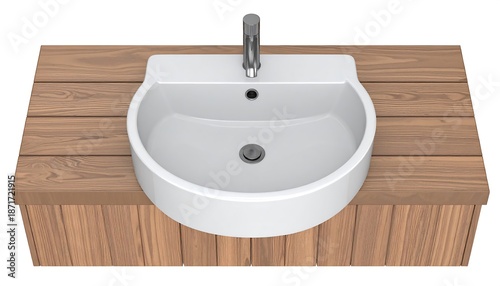 A pristine, white, semi-circular sink with a silver faucet is situated atop a rich, wood-paneled cabinet. The perspective is directly from above