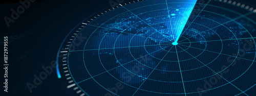 Futuristic digital radar interface data detection and monitoring technology. Blue scanning beam over grid display represents cybersecurity, surveillance systems, advanced digital tracking concepts.