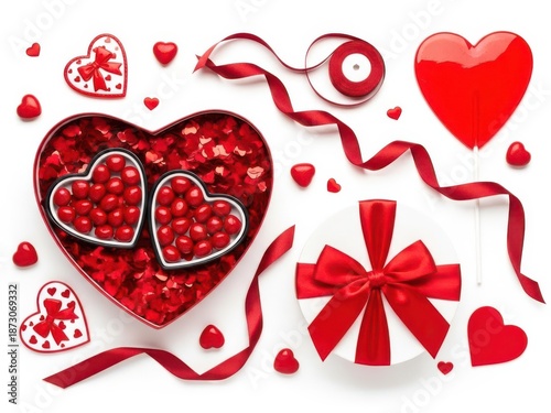 Heart-shaped box filled with red candies and surrounded by decorative hearts and ribbons