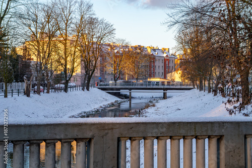 Zimowy krajobraz miejski z rzeką i mostem w porannym świetle. Śnieg pokrywa brzegi, a zabudowa miasta odbija ciepłe słońce zimowego dnia spokojnie