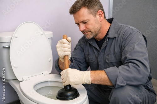 Man fixing clogged toilet with plunger in bathroom, focused plumber in work over white ceramic bowl wearing gloves and grey uniform
