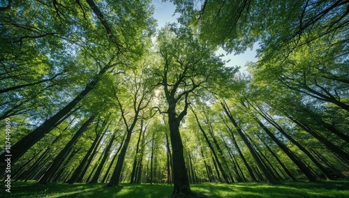 Beech trees in a lush green forest seen from below highlighting natural canopy structure, ideal for nature-themed backgrounds