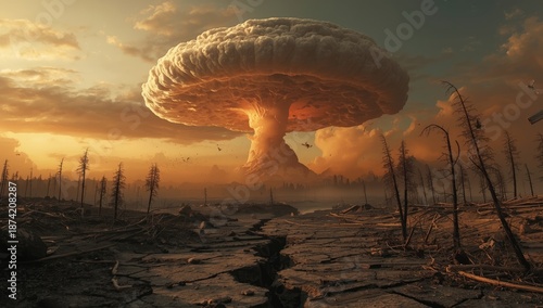 Atomic weapon detonation with a massive mushroom cloud, highlighting the destructive impact of nuclear conflict