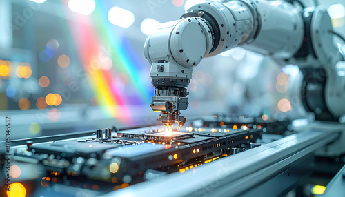 Precision Assembly: A robotic arm meticulously places a microchip on a circuit board, symbolizing the cutting edge of technological advancement and automation in manufacturing.