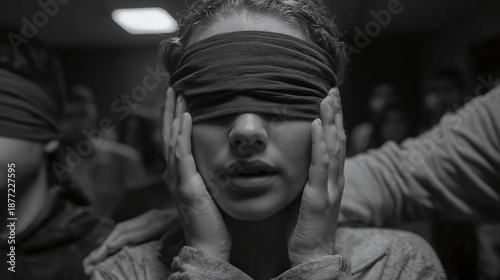 A woman is blindfolded and experiencing something that is unknown. She is in a room with other people who are also blindfolded. This creates an atmosphere of suspense and mystery