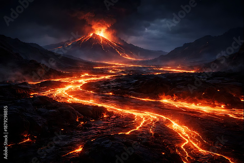 夜の火山地帯に流れる溶岩の壮大な風景