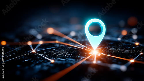 A glowing location pin icon on a digital network grid, representing geolocation services and location based technology systems.