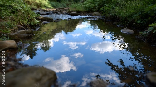 A shallow forest stream reflects the blue sky and fluffy white clouds surrounded by green foliage and rocks