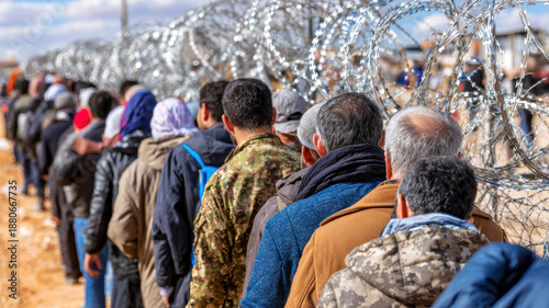 A lot of poor refugees walking along barbed wired fence, humanitarian crisis