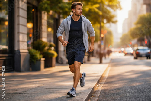 Fit young man jogging in a city street at sunrise, urban running workout in sportswear