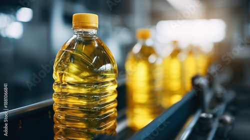 Row of fresh vegetable oil plastic bottles on a conveyor line in a food production plant