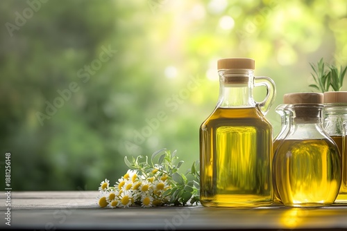 Glass bottles of golden oil with chamomile flowers