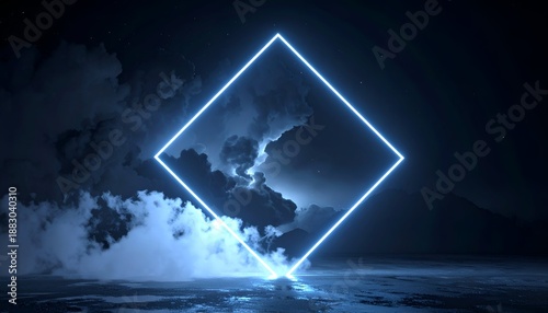 A luminous diamond shape floats in a misty, dark landscape, surrounded by soft clouds and shadows