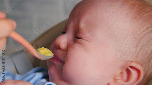 Close-up of a fussy baby's face showing disgust. Infant squeezes eyes shut, refusing to eat first solid food puree from a spoon. Authentic, relatable parenting moment