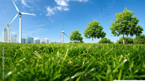 Green Grass Field with Trees and Wind Turbines Against Clear Blue Sky and Urban Landscape in Background