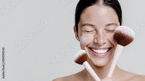 Smiling woman with makeup brushes: joyful beauty and self-care concept