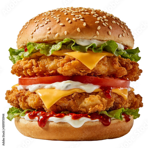A double-decker crispy chicken burger with melted cheese, fresh lettuce, tomato slices, and sauces, topped with a sesame seed bun. Ideal for a savory, filling meal.