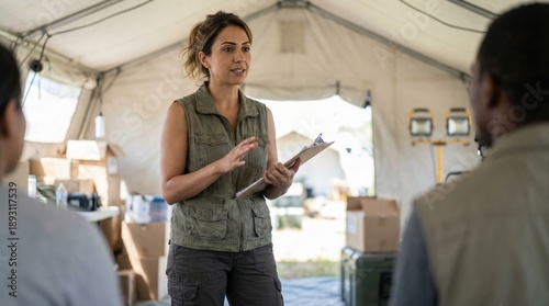 woman leading discussion in humanitarian aid relief tent surrounded by supplies