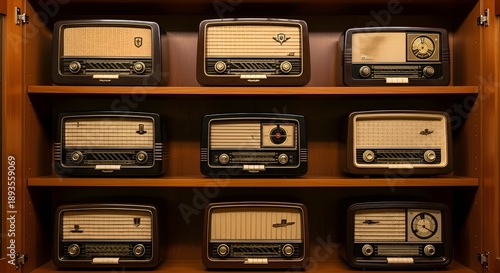 A timeless collection of vintage radios, artfully displayed to highlight the classic design and enduring appeal of early sound technology