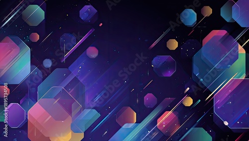 Abstract, geometric shapes float against a dark blue background with colorful gradients and streaks