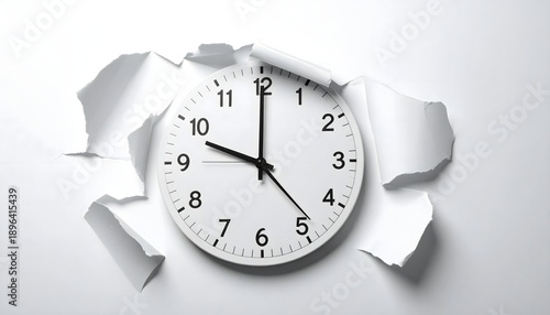 Reloj de pared blanco atravesando una pared rota, concepto de tiempo invasivo y presión psicológica