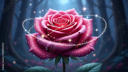 Enchanting deep pink rose covered in shimmering glitter and dew drops glows magically in a dark fantasy forest setting