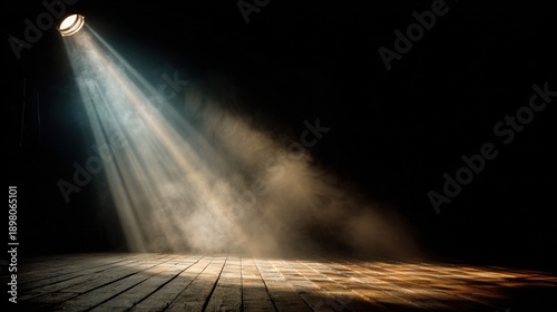 backstage. Dramatic spotlight on an empty wooden stage, creating a theatrical and mysterious atmosphere. event programs, museum guides, designed for cultural heritage projects and event programs.