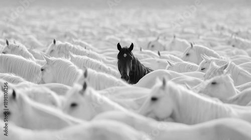 Lone black horse standing in a vast herd of white horses captured in black and white symbolizing uniqueness and individuality ideal for concept art and editorials