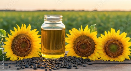 A glass jar of golden sunflower oil surrounded by fresh seeds and vibrant yellow sunflowers in a field