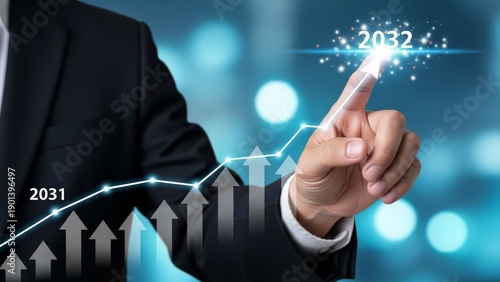 Businessman's finger points to the future year 2032 on a glowing upward trend graph.