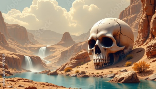 an intriguing desert landscape dominated by a large skull, which is situated atop a rock formation
