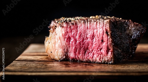 sirloin. Close-up of a juicy beef steak on a rustic wooden cutting board, showcasing rich textures and grill marks. menu design.
