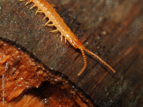 Miriápodo litobiomorfo de cuerpo segmentado naranja. Posee antenas largas y articuladas junto a patas laterales diseñadas para el movimiento rápido entre la madera en descomposición.